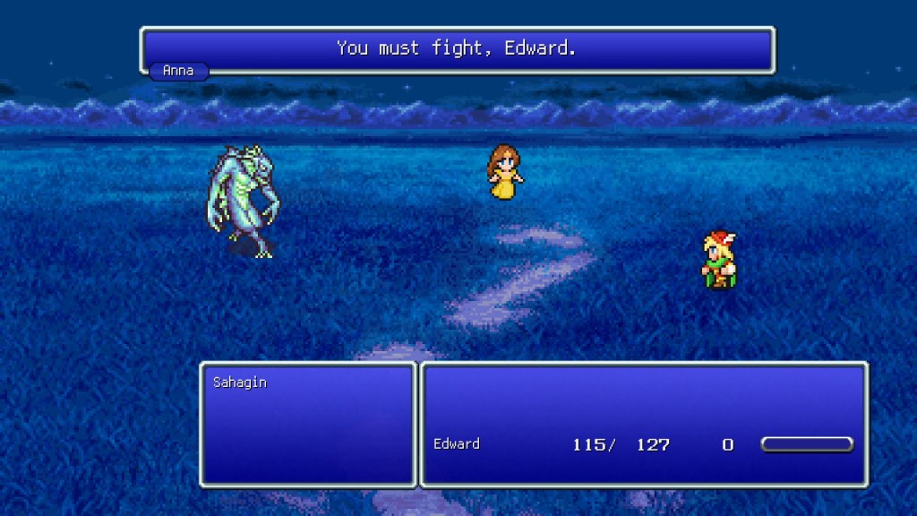That said, I only dislike Edward from a battling perspective. After the party returns the sand ruby to restore Rosa, Edward is visited by a vision of his dead lover who gives him the purpose to stick with the party in order to help stop Baron from getting all of the crystals. This was more character development than any single character got in the first three Final Fantasy titles and Edward isn’t even one of the most important characters. It’s a great moment and absolutely justifies his presence in the party.