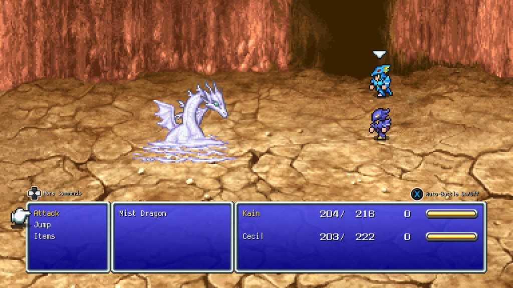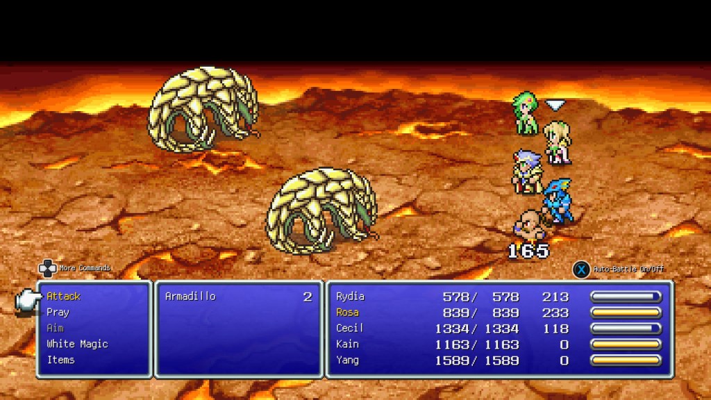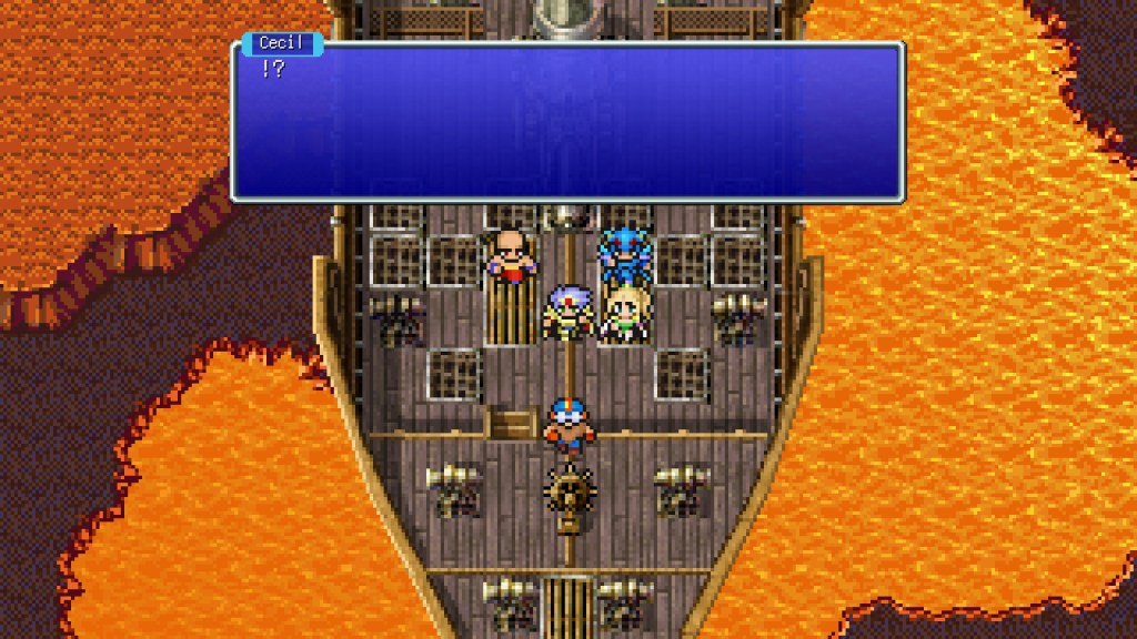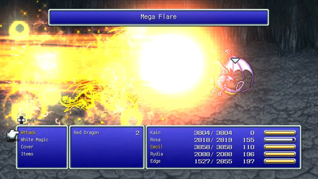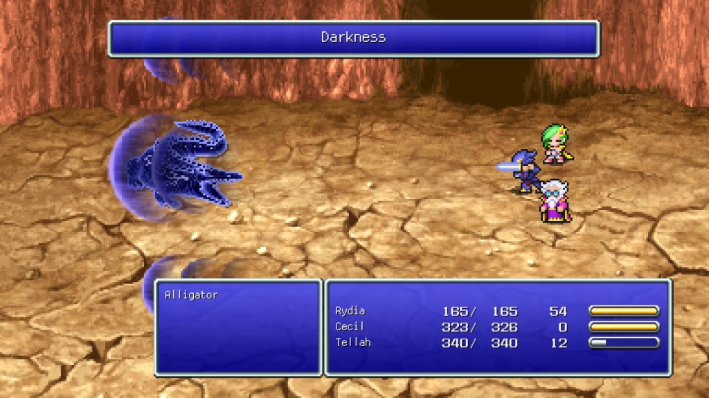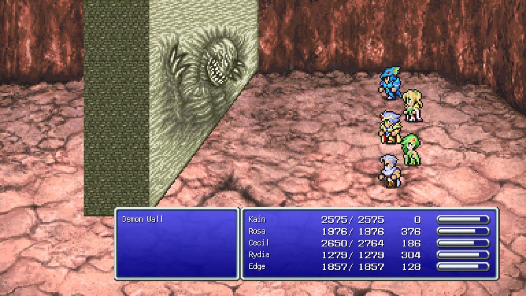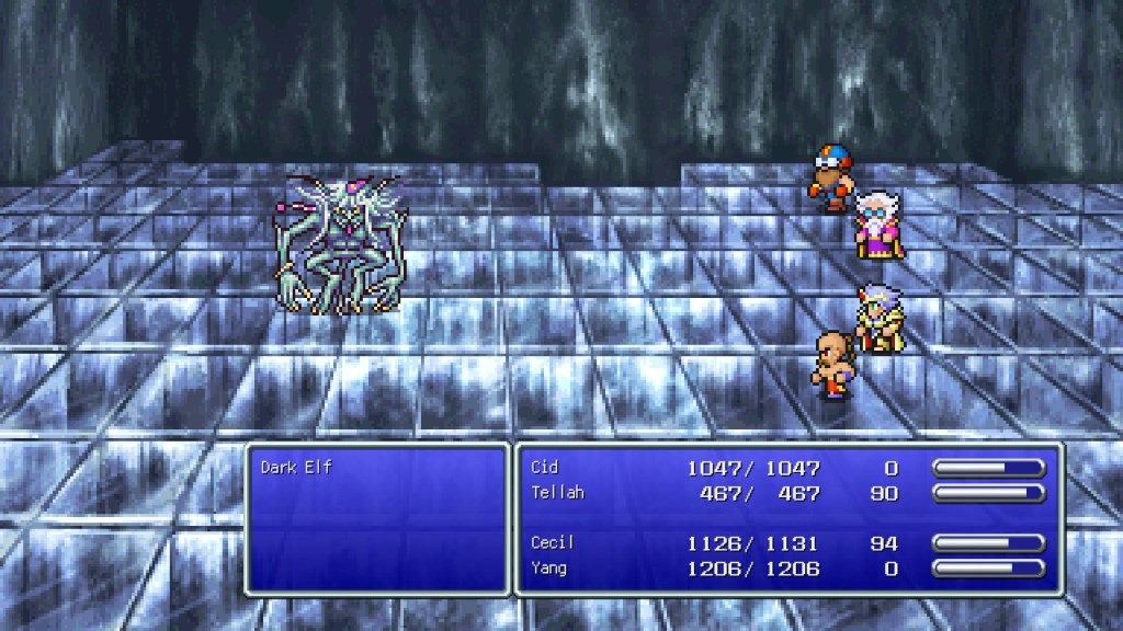 So while you may think ease of access to healing and magic might make things a little easy, I found the experience of FF IV to be a little more balanced than the other three games. In Final Fantasy I and III, the entire adventure (in the pixel remaster) was relatively easy up until the very final parts of the game. Then they were like “training wheels are off, it’s go time.” In II, it’s pretty easy throughout with most of the difficulty I experienced coming from walking slightly off the main path. In IV, things felt the same level of ‘difficult but manageable’ the whole way through. I had to think more in my random battles and I found boss battles required more strategy. I did think the beginning of the game was a little challenging with how the party is composed (Cecil and squishy mages), but part of that could have been me using the active ATB meter instead of wait.