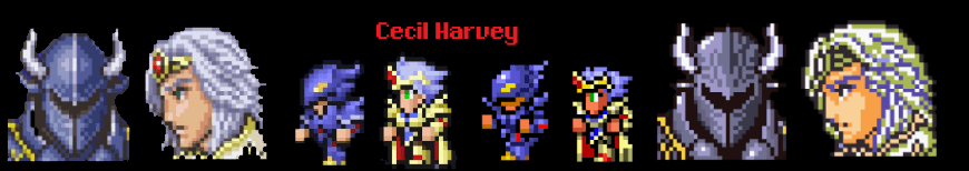 For the Pixel Remaster of IV, I feel like a lot of the sprites between the Super Famicom/SNES version and the Pixel Remaster version are pretty similar. Still, I included comparisons for the Famicom games so I thought it was wise to keep consistency going. The main difference between the original release and pixel remaster seems to be that the Super Famicom sprites have a much darker skin tone. If a more jarring change pops up I will make note of it. My ordering for most character comparisons goes “PR portrait followed by original portrait followed by PR battle sprite and then the original battle sprite.” The exception for this would be Cecil, Rydia and Palom/Porom. For those it’s two PR portraits, two PR sprites followed by two original sprites and two PR portraits.