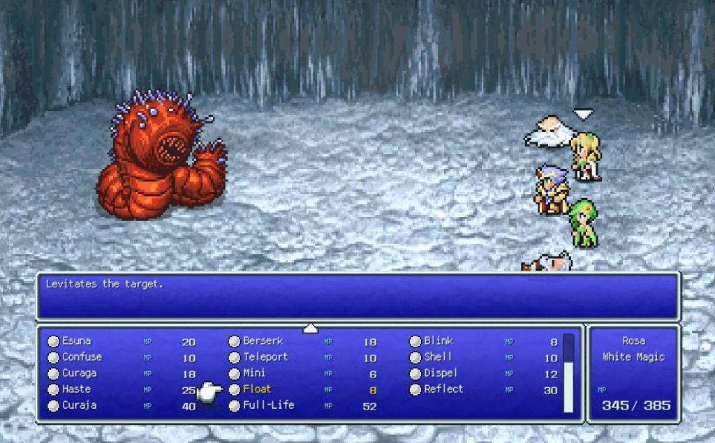 Most ATB games include two different modes. “Wait” and “Active.” The main difference between these is that time will freeze while you’re browsing spells or items in wait mode. So in active mode, while you’re trying to remember where the hell the ether in your inventory is because you didn’t automatically sort them, you have to deal with enemy attacks pounding you while you hunt. This adds a lot of tension to fights. There were times in Final Fantasy IV where I felt a sense of panic while looking for white magic spells because the enemy barrage would not stop. The original release of Final Fantasy IV (in the U.S. at least) did not have a wait mode, so it’s nice that the difficulty was lowered a little bit for that international release, eh? Once again, I’m using the pixel remaster for this recap, and that version does indeed contain both modes. So when you’re browsing Tellah’s massive spell catalogue early on, take your time!