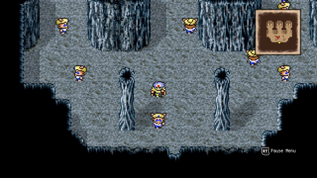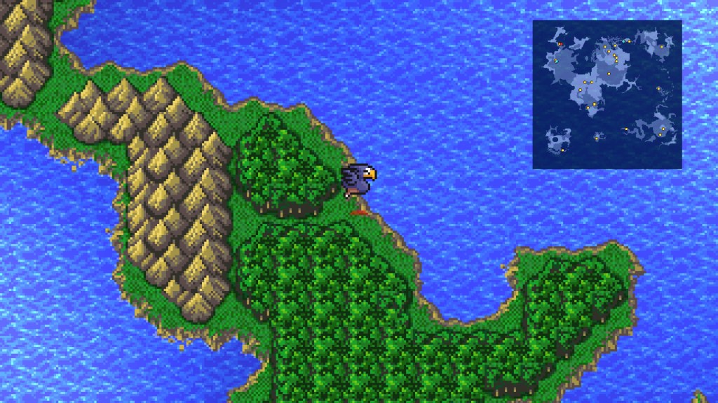 Here, the difference between the overworld and underworld are pretty stark. All of the underworld NPCs are dwarves (they look like little Vivis) and all of the water has been replaced by lava. In fact, the III progression system of ‘we will block off part of the world with obstacles your airship can’t mess with’ comes back here as your initial airship can’t fly over lava. It may not seem like a super innovative thing to have a region of specific NPCs, but it does help you feel like you’re in an entirely new region. It’s a bit of world building that requires no additional text to portray. Your mind cobbles together a little bit of explanation and that’s it. “Dwarves live here, I’ve never seen them in the overworld. Do they prefer hot environments? Is there some sort of anti-dwarf racism going on?”