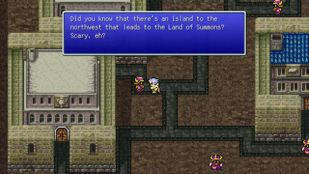 This is a little contentious, but I’m going to attribute this to IV. In Final Fantasy III your optional summons did have dialogue but everything else was bought in a magic store, which to me suggested they were mindless monsters with one sole purpose. In IV, that ability is gone and instead eidolons form a relationship with a summoner that allows it to be summoned. You discover these things have thoughts and feelings when you travel to the Land of the Summons in the underworld. A little girl in this area laments that she has fangs and claws unlike Rydia, who just looks like a regular person. It’s simple stuff, but it adds some depth to the world.