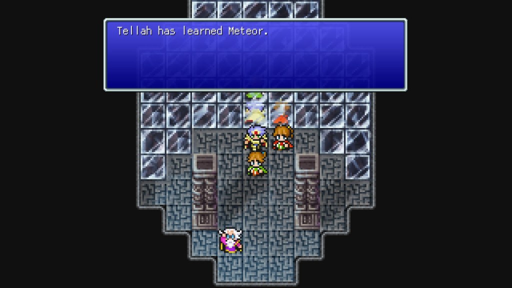As a party member, Tellah has so much promise but delivers so little. The player opens up his spell catalogue and is just flabbergasted at all the options he has available at such a low level. For players of Final Fantasy III, Tellah’s class is sage, which means he has access to both white and black magics. So it’s really weird seeing something like Curaja and Flare in a party member’s spell book well before anybody else has access to such spells. Regardless, he has a very limited MP pool – it caps out at 90 – so his ability to actually use those spells is pretty limited. It makes sense given how early in the game you have access to him, but it does feel like something of a tease.