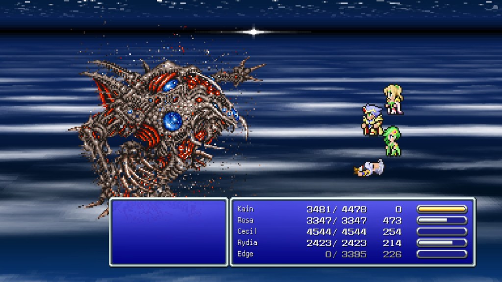 All you need to do is keep attacking. I don’t know why, but in my second try, both Rosa and Rydia survived the initial big bang and kept going strong. The same issue happened during Cloud of Darkness in FF III where it felt like the enemy was doing inconsistent and random damage. Maybe I got hit with a critical or something? I’m unsure but I won and the only casualty was Edge.