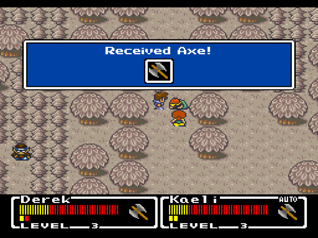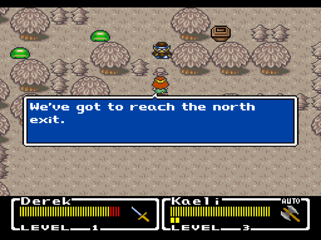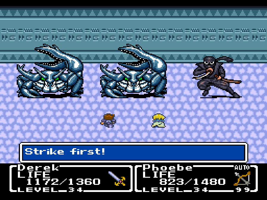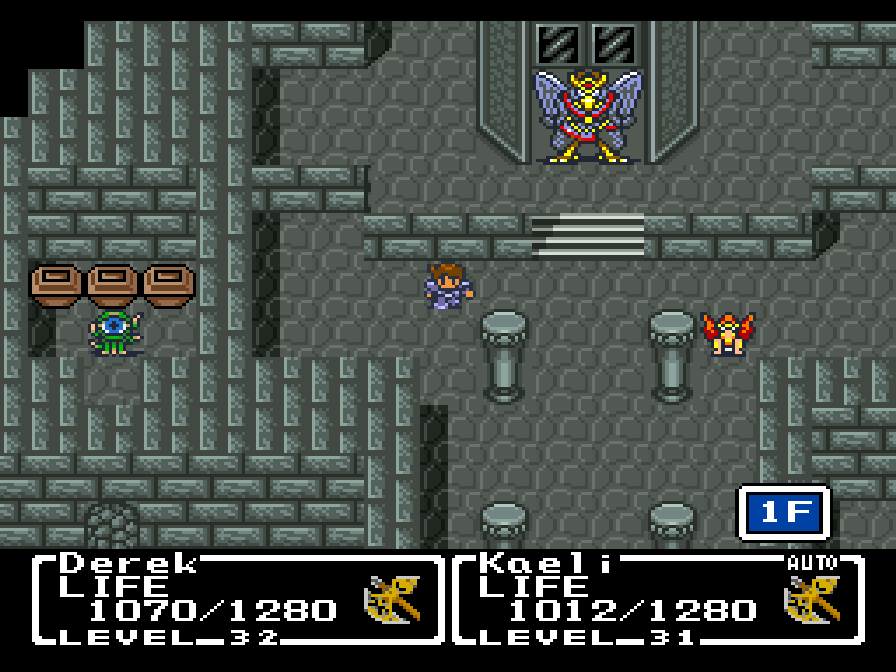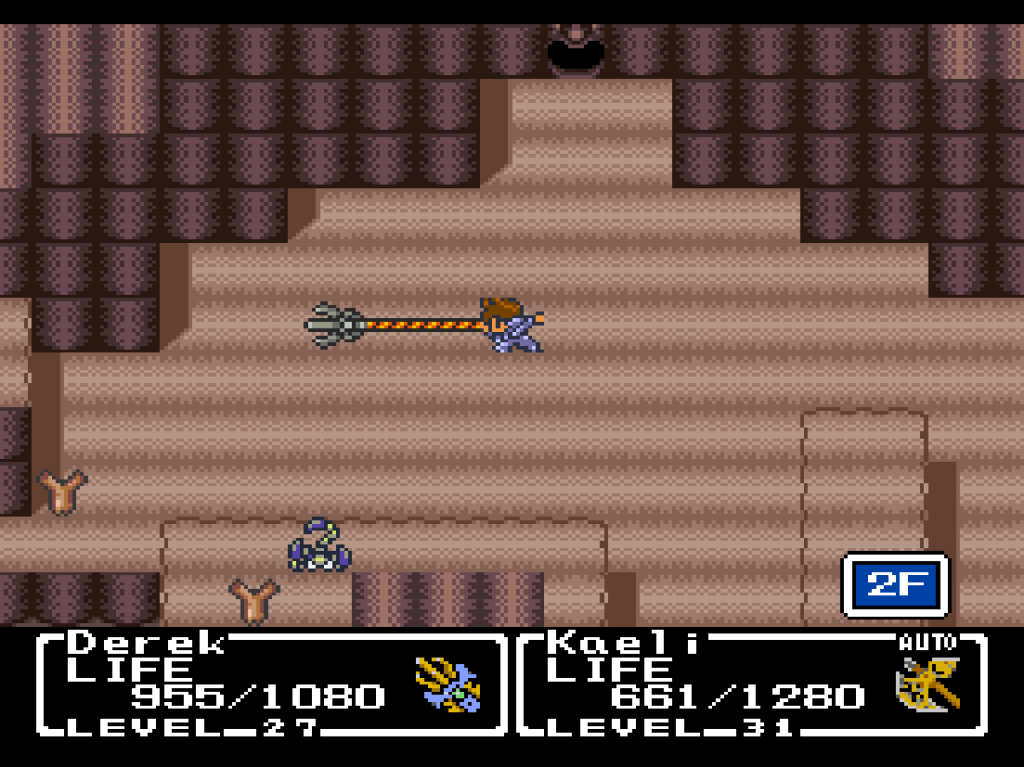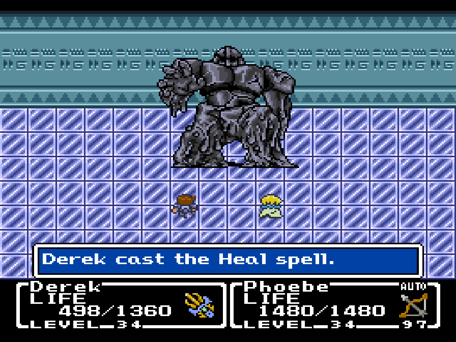 Mystic Quest trims your party down to only two characters and if you so choose, you only need to control one character. The game defaults to your secondary character acting automatically, though you can press a button to change to manual commands. MQ also utilizes the Final Fantasy II and IV approach of having characters constantly entering and exiting your party. The secondary character is always a fair deal stronger than your main character when they show up but by the time they leave, your protagonist should be equal to or greater than them. It’s an easy way to determine whether someone is going to leave your party soon or not. Are you their level? If so, prepare to say goodbye!