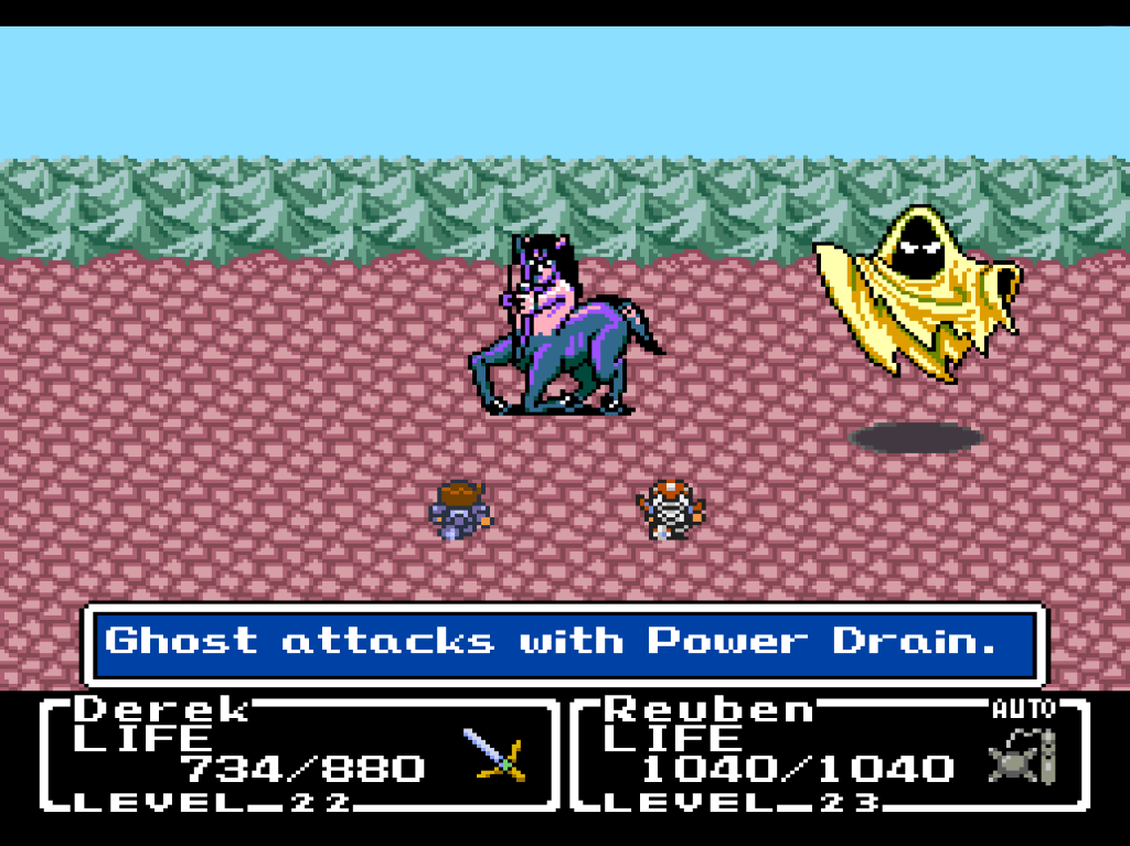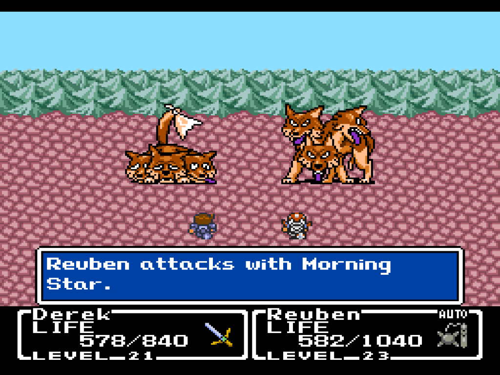 True turn-based gameplay is back. So if you were getting sick of holding it in while you wait for battles to play out, you can once again tell your main character to act and then run out to the bathroom while everyone takes their turn. Given that you only have to put in your main protagonist’s commands if you’re on auto battle, this can lead to some very repetitive encounters. For a large portion of the game, I was just having my two characters attack. I know I said in my FF1-3 recaps that I spend most of my battles just physically attacking but at least there were four party members to choose from. Like if I wanted to attack enemies in other ways, I definitely had options. It felt a little more in depth.