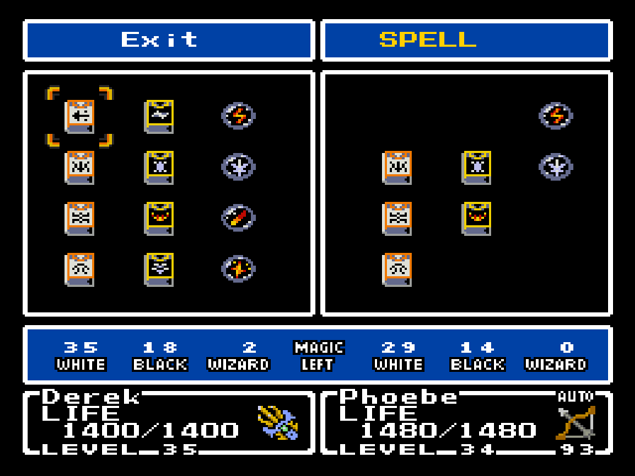 The spell book on the left is the main character’s magic and those 12 spells represent your entire catalogue. You have four white magic spells, four black magic spells and four wizard spells. For white magic you get Cure, Heal, Exit (for leaving dungeons) and Life. Black magic gets Quake, Fire, Blizzard and Aero. Wizard magic gets Thunder, White (holy, or as Kingdom Hearts fans know it as, Pearl), Meteor and Flare.