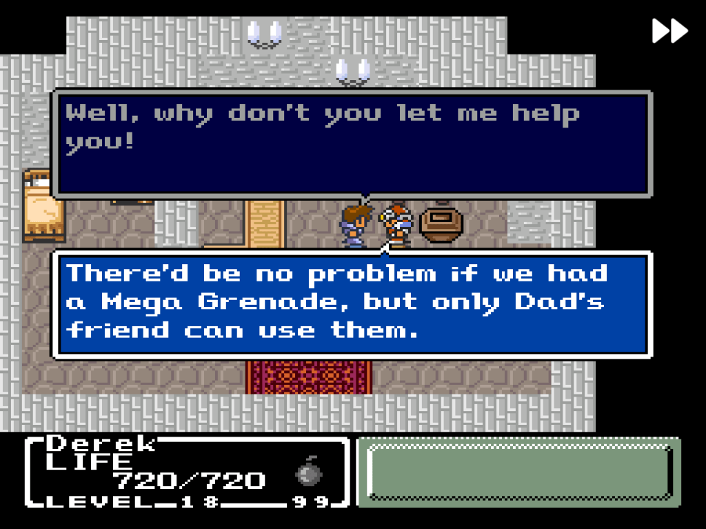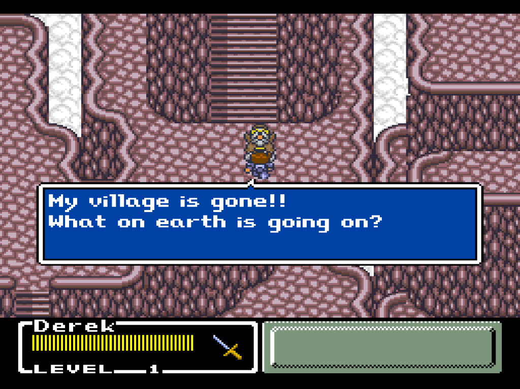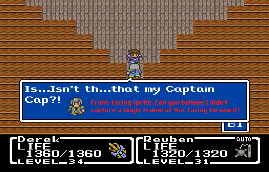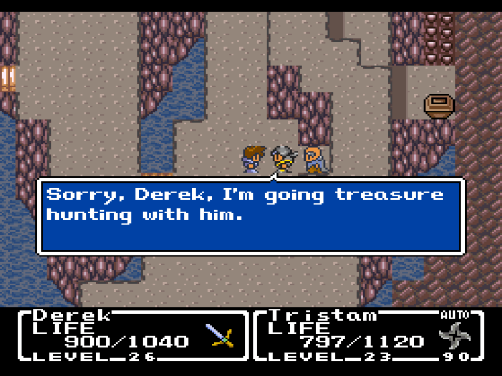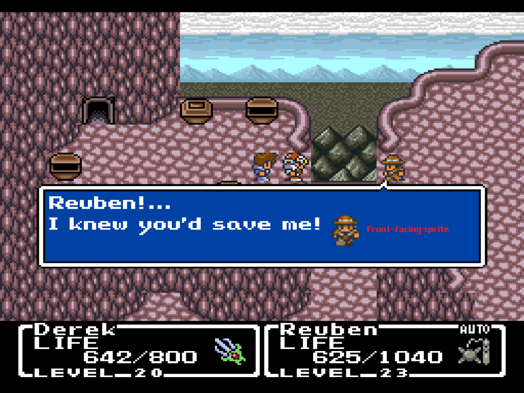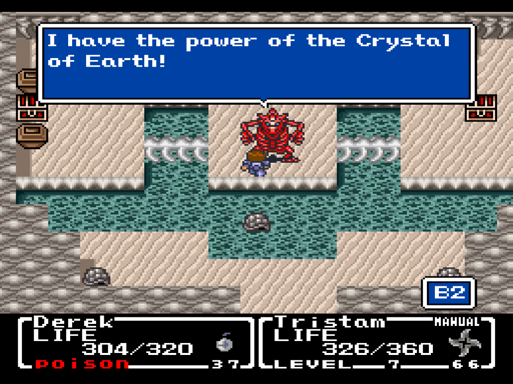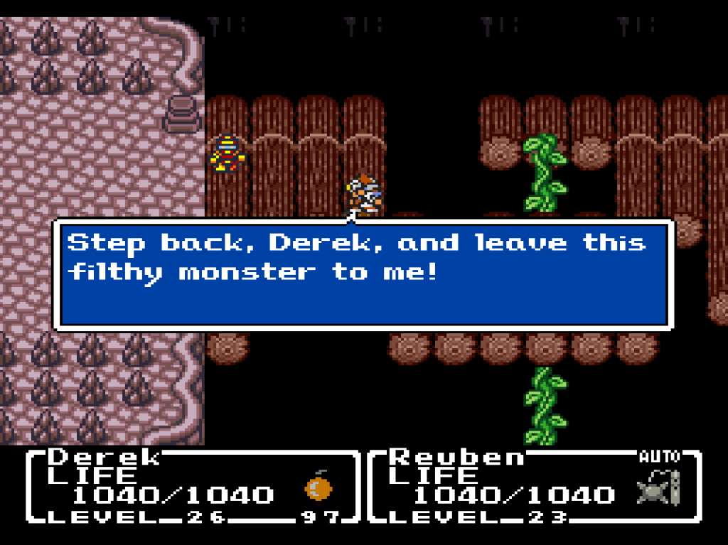 Your final party member! Hey you make four friends and the main bad guys are called “The Vile Four.” Do you think there’s a correlation there? Who can say. You meet Reuben when you’re trying to find the fire crystal. He tells you his dad knows where it is, but his dad is trapped behind a boulder somewhere and he needs your help to save him! So everyone wins by this alliance. Reuben is the first party member you get who doesn’t seem like he wants to ditch you, so the game invents a reason for him to ditch you by giving him the half-a-second fakeout death I mentioned above. How rude. He comes back later to help you reach the final dungeon but quickly leaves again.