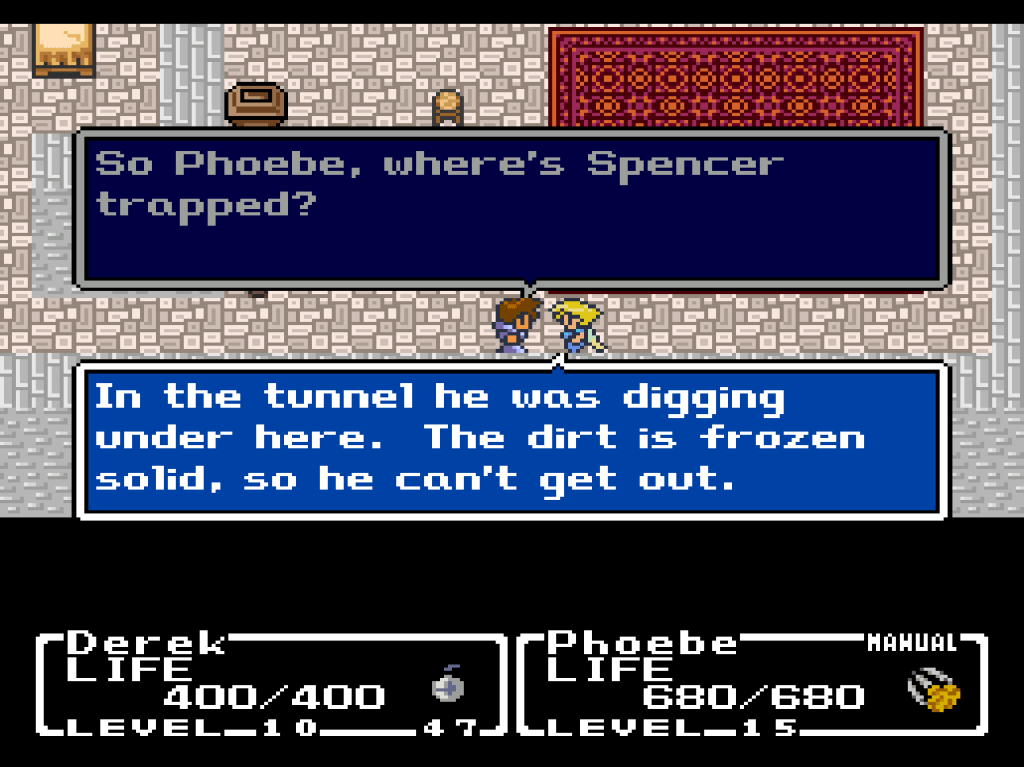 Spencer is Phoebe’s grandfather. He is trying to dig a tunnel from underneath Phoebe’s hometown of Aquaria all the way to a lake where another important character, Captain Mac, is trapped. The goal of this is to get Aquaria’s water into the dried lake where Mac is stuck. A one man digging operation seems like the most efficient way to do this, sure. Unfortunately Aquaria is frozen over when you reach that area and Spencer is trapped down in his little tunnel. Not to worry, his plight is why Phoebe joins your party, so his suffering is your gain. When Spencer gets free, our good friend Tristam lures him away from his work with the promise of a treasure hunt. He bails and then in the best scene of the whole game, Phoebe gets frustrated and throws a bomb in an effort to complete the tunnel really quickly but this fails and just destroys this guy’s hard work.
