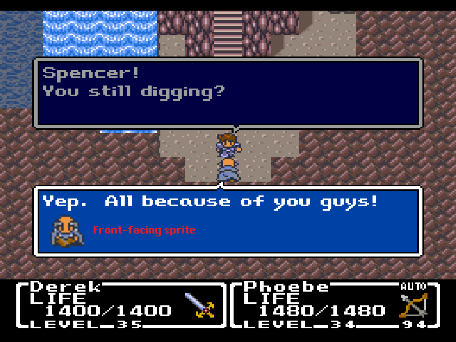 When grabbing screens for this game, I forgot to grab some for characters I thought were important. Every single stinking picture of Spencer I have in my FINAL FANTASY: MYSTIC QUEST folder is from a side profile, the end of the game with the entire main cast that would be really weird to use here or from the back like this. So I went ahead and attached my favorite Spencer screen and just hastily placed front-facing Spencer on there. There might be one or two more guys I do this with. Plus I just love this dialogue exchange because Spencer just likes digging. Dudes rock, ya know?