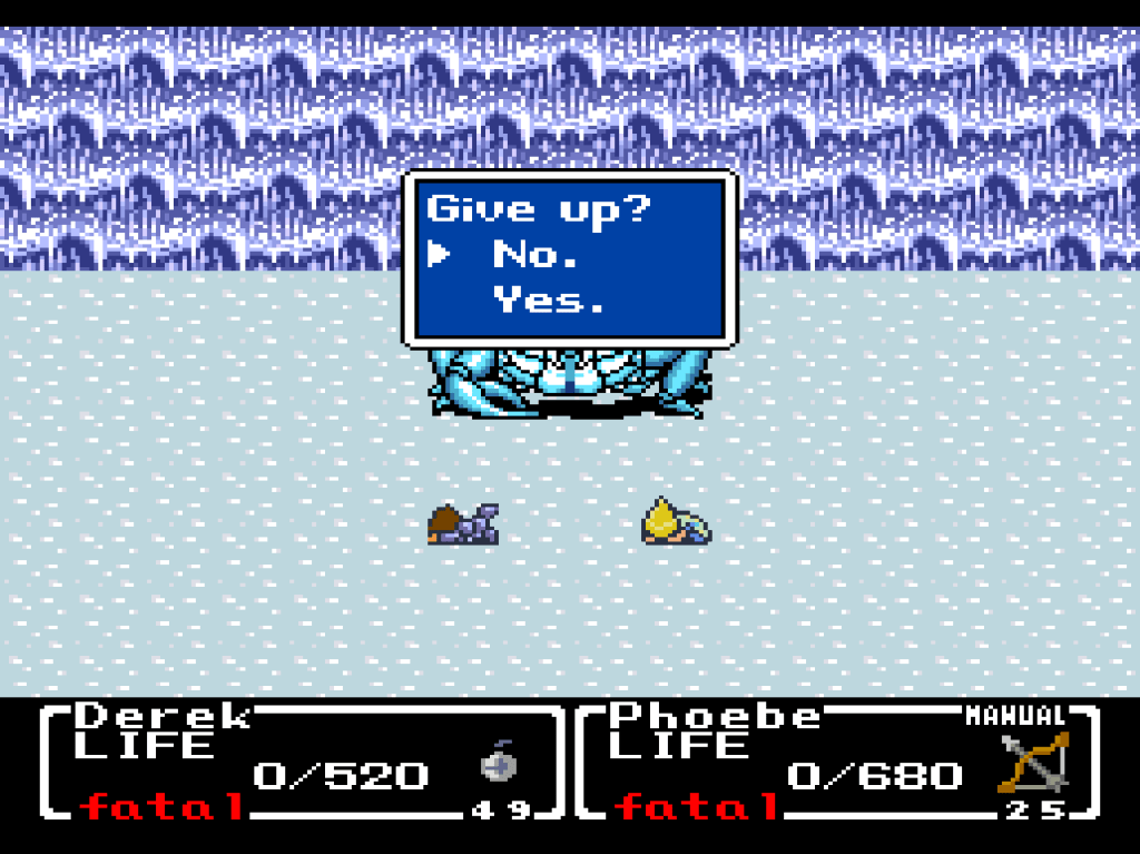 Bosses have multiple damage sprites, which helps give character to those battles and helps those characters stand out from the rank-and-file. Hey man, the battles themselves aren’t that interesting so they gotta do something, right? The Dark King seems to eschew battle damage to give you forms, which I think is a poor substitution because it just makes the Dark King stand out as the only bad guy in the game who doesn’t show proof of your prowess.