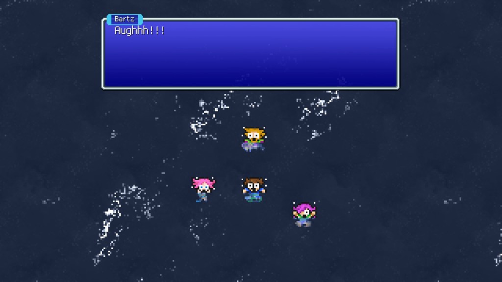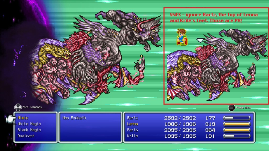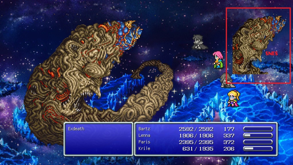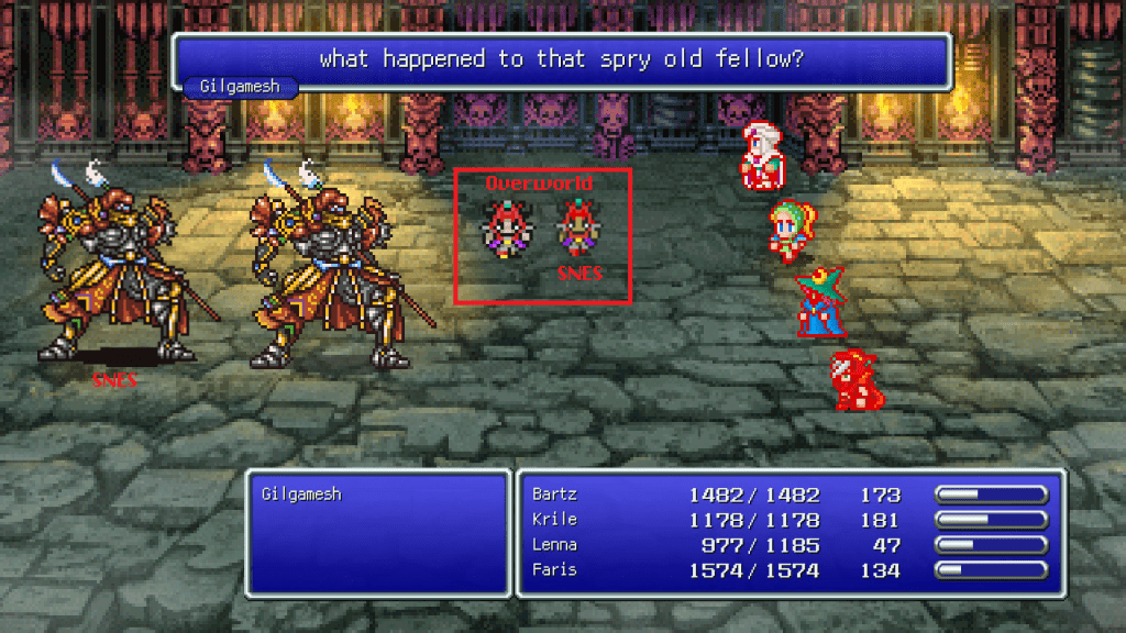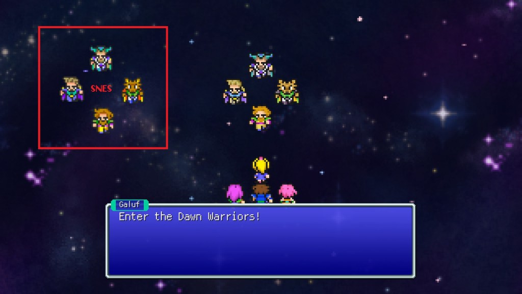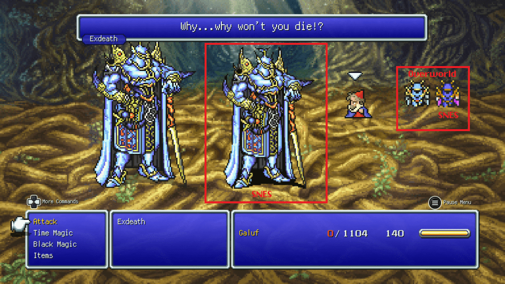 I struggled with whether to include sprite comparisons in this retrospective because when I would watch footage of Super Famicom gameplay, I wouldn’t see a lot of differences compared to my own footage. So then I threw together a picture of Bartz to try to challenge the reader to spot the difference and…the differences became immediately obvious to me. I won’t comment on the changes unless there’s something glaring, but my general thoughts are “The Pixel Remaster looks too clean, I prefer the original sprites. They have slightly more detail.”