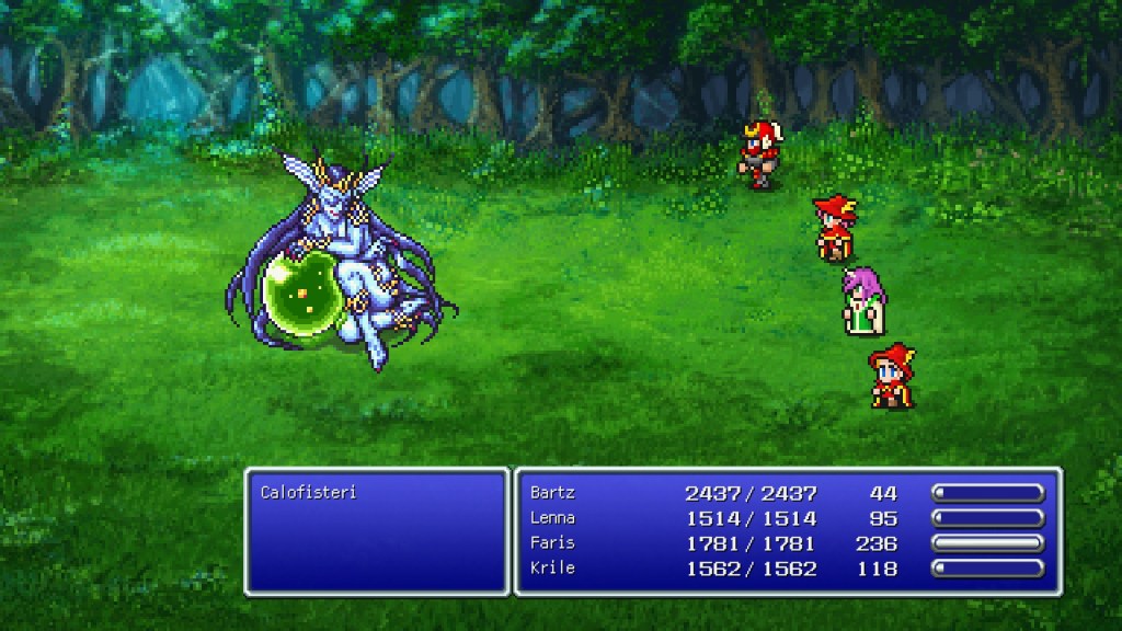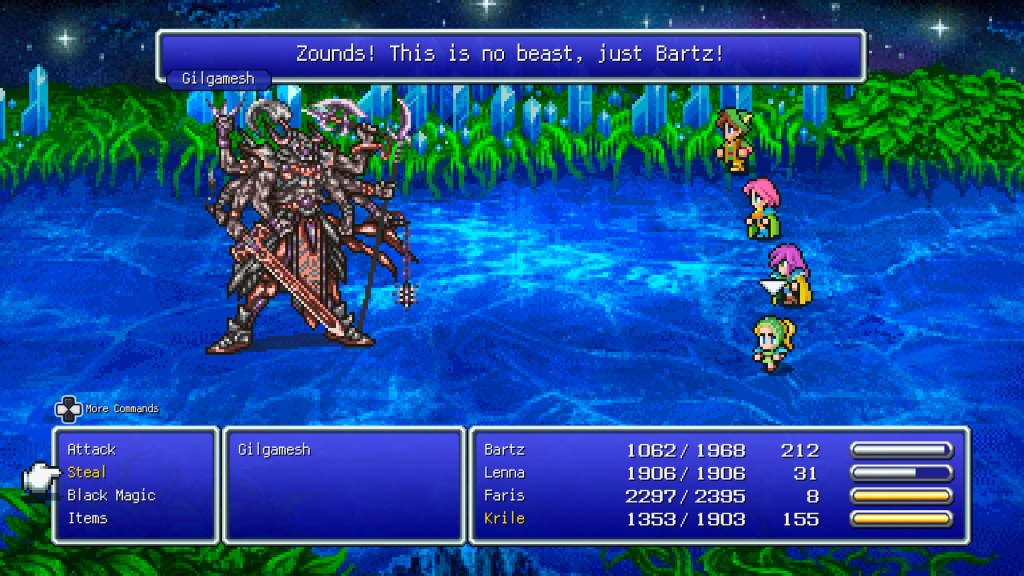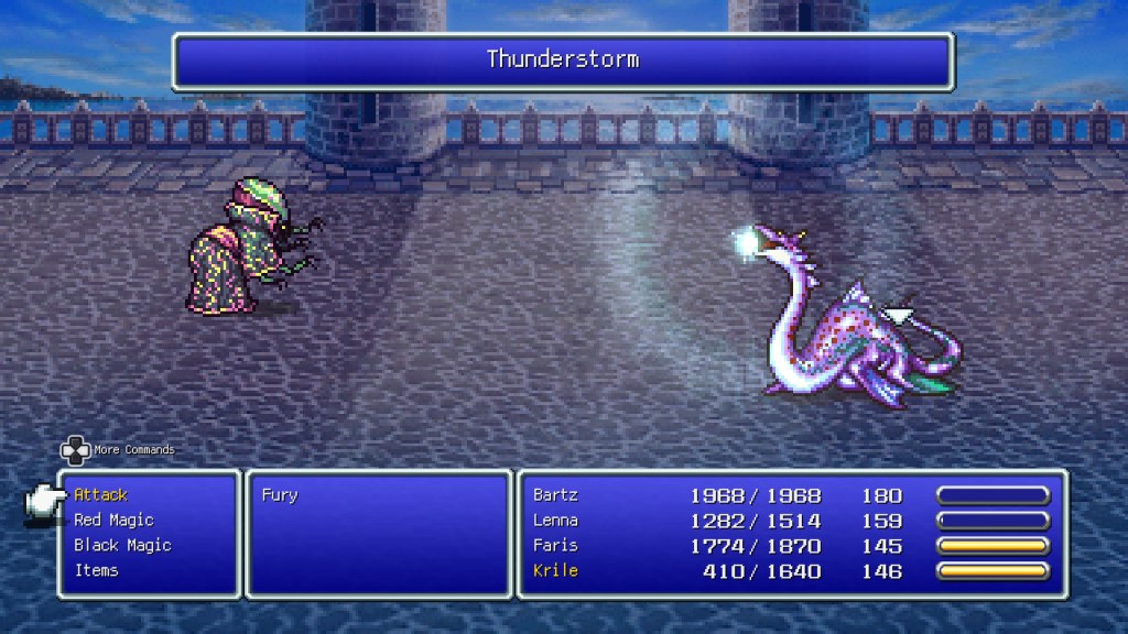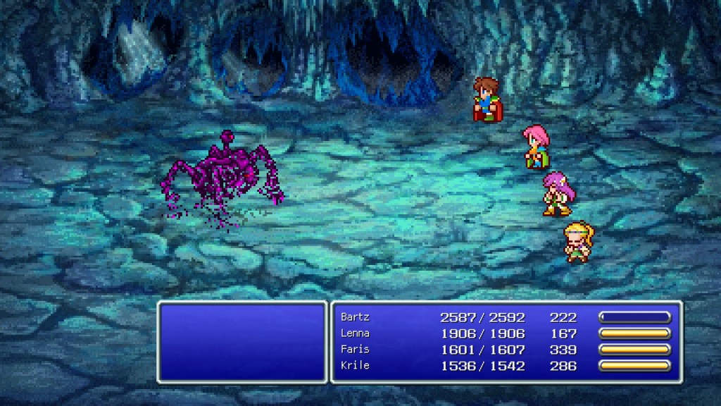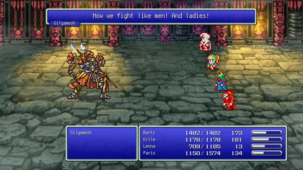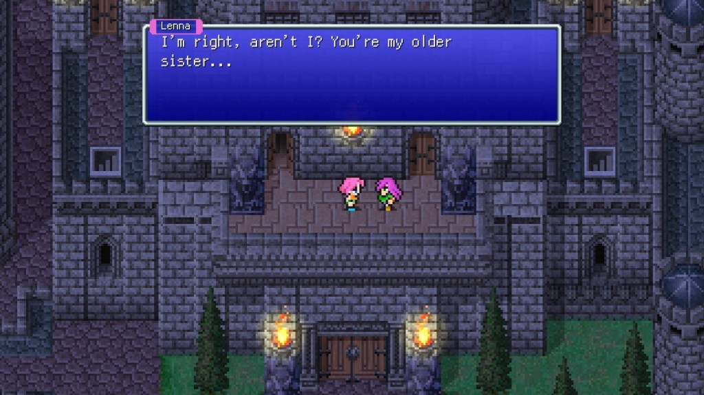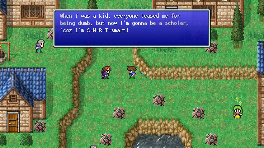 I struggled with whether to include sprite comparisons in this retrospective because when I would watch footage of Super Famicom gameplay, I wouldn’t see a lot of differences compared to my own footage. So then I threw together a picture of Bartz to try to challenge the reader to spot the difference and…the differences became immediately obvious to me. I won’t comment on the changes unless there’s something glaring, but my general thoughts are “The Pixel Remaster looks too clean, I prefer the original sprites. They have slightly more detail.”