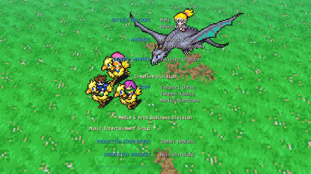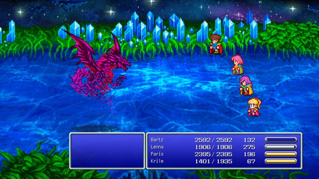 I just like that all four of the main characters have their own little animal companions. It might seem unfair that Boko gets an entry while Syldra and Hiryu have to share with Faris and Lenna respectively, but at least they don’t share the same fate as Krile’s wind drake. I don’t even remember that thing’s name!
