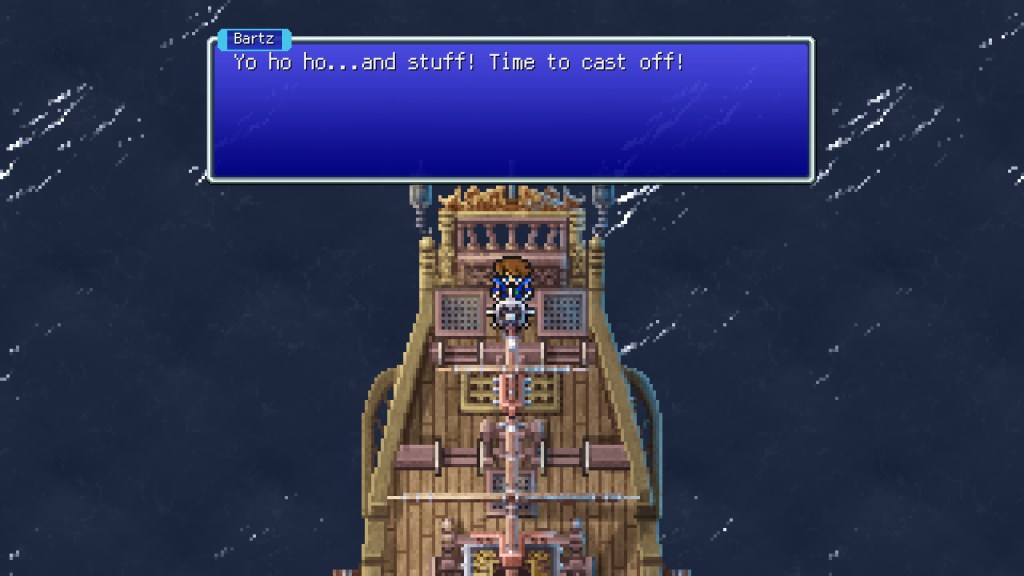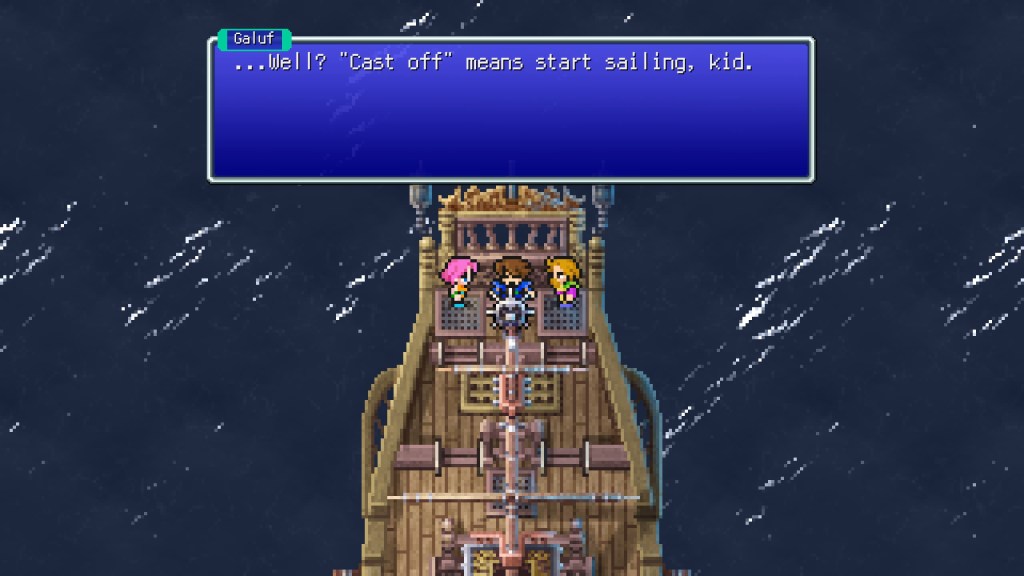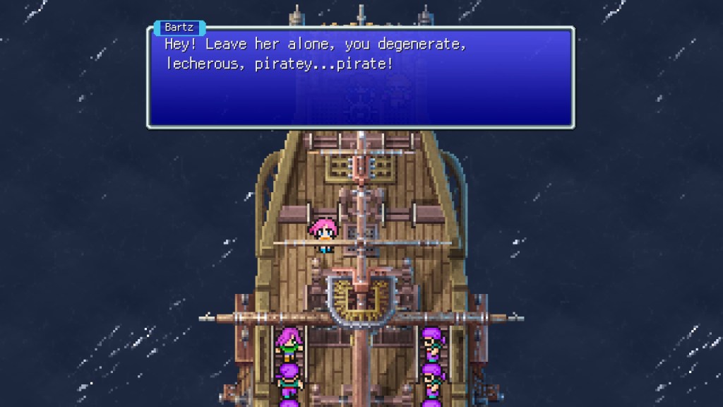 The game is very tight lipped about Faris at first, to the extent that they avoid using gendered language to discuss her for a while. It becomes excessively obvious that Faris is supposed to be a woman who is pretending to be a man so people would not take her less seriously as a pirate. In a game with voice acting, this is exceptionally hard to pull off – I think of Fire Emblem: Awakening English dub where the game introduces a character named Marth with a very feminine voice – but in a game with no voice acting and pixel art it’s a little bit easier. Of course, the writing here gave it away, but hey.