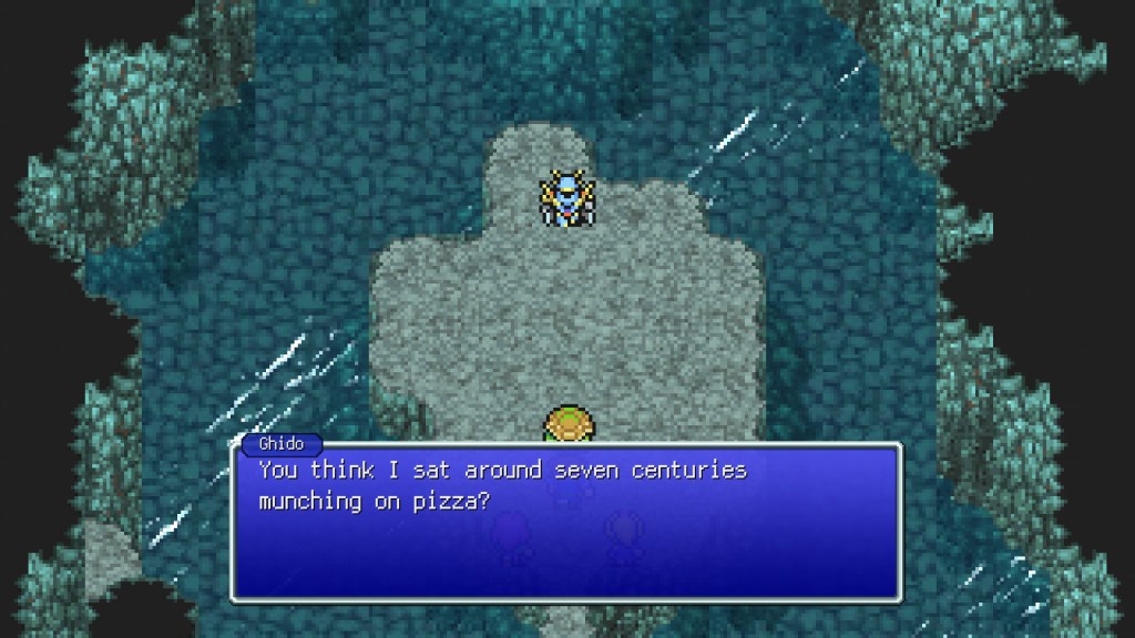 Your eyes do not deceive you. Ghido is a turtle. He is an elder sage that mostly exists to spout plot at you. He reveals that Galuf’s world and Bartz’s world were actually one at some point and they split in the first place because the crystals split. This was done because of a force of destruction called “the void” that was used to level entire continents well before the events of Final Fantasy V take place.