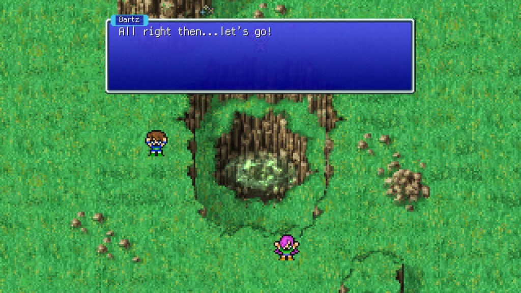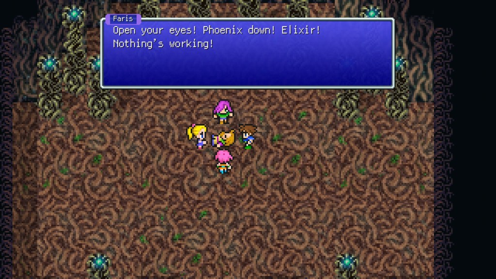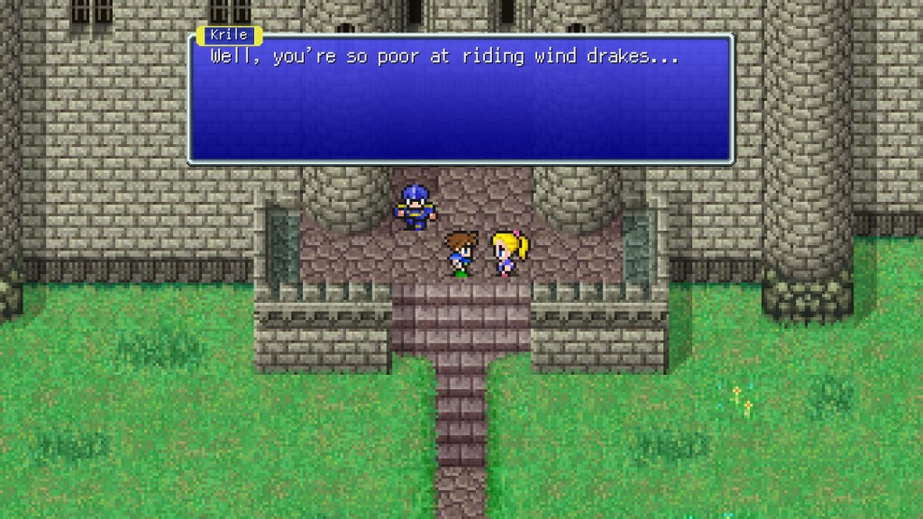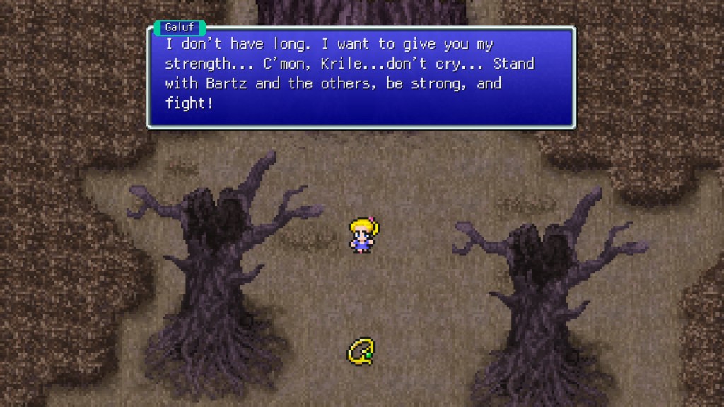 Since we are down one warrior of light and we need four of them, Krile ends up taking up the cause for her fallen grandfather. This is going to sound incredibly corny, but bare with me. The scene reminded me of when a super hero or something would ‘die’ in a comic or if like a Power Ranger had to go off to a world peace conference or something like that. Krile suddenly just absorbs all of the power of her grandfather and everything continues as it had been. The cheesy feeling fits with this game’s tone, so it’s not like I really minded it.