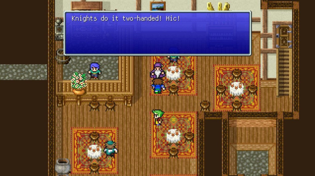 My favorite thing about these two is a neat little bit of sprite work the game does to show them working hard and time progression. Whenever I think of time progression in the Final Fantasy franchise, my mind wanders over to the Nibelheim flashback in Final Fantasy VII where they just flash to Sephiroth in various scenes pacing around the Shinra mansion. I like the 16-bit take on that because it’s creative and makes use of the limited tech of the time. Just clone the characters!