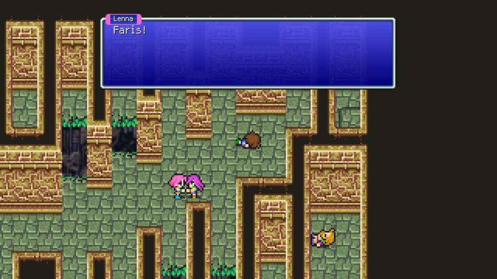 Best dressed: I really like the simplicity of Lenna’s sprite here. It looks elegant. Sometimes I feel like they just didn’t know what to do with Faris. Here she has what looks like a palette swap of Bartz’s attire but missing the cool moon thing that he (and Krile and Galuf) has.