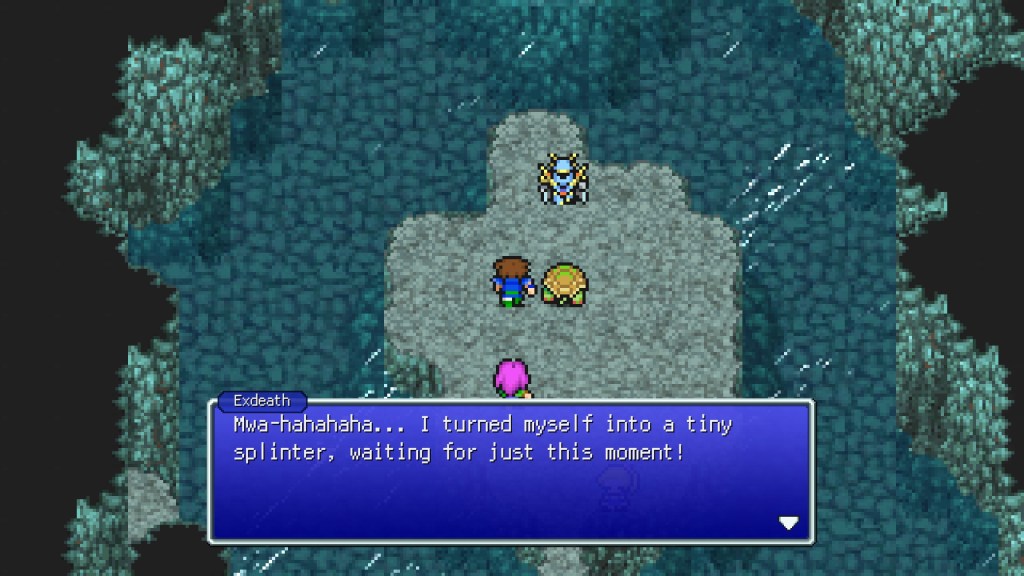 The tone extends to the villain of the game, Exdeath. He’s portrayed as all powerful and a force to be feared, but he comes off as something of a Power Rangers villain. He doesn’t have a lot of trusted allies, his right-hand man for a majority of the game is a guy named Gilgamesh who is essentially a joke villain, and instead he just throws random monsters at you hoping that it will stop you in your tracks. One of my favorite scenes in the game involves the big sinister villain going toe-to-toe with a very old turtle sage. It’s something I adore, but it does take his intimidation down a notch. Despite having a name with the word ‘death’ in it, Exdeath just doesn’t feel very threatening.