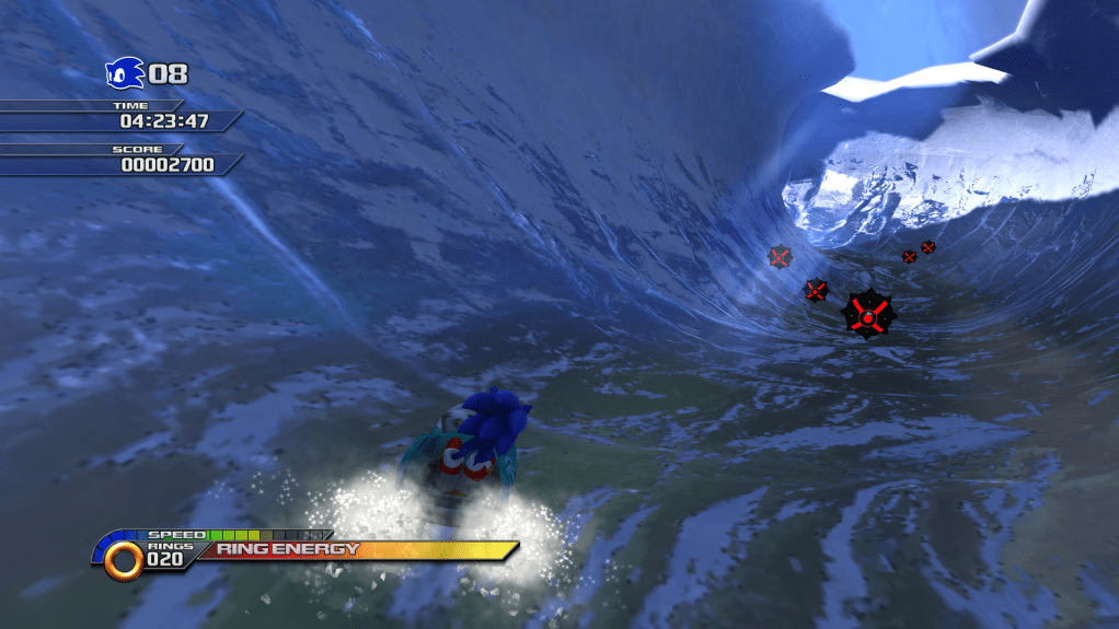 In this playthrough, I also came across a number of glitches that hindered play. You frequently have to grab onto ledges and pull yourself along them – if you’ve ever played a 3D platformer, you probably know what I’m talking about. Multiple times when I’d pull myself up from these ledges, I would clip into a wall or something and Sonic would be stuck in the wall. When this happened, there would be no way out. There is no auto-kill Sonic or “restart at checkpoint” option. Instead, you need to restart the entire level again.